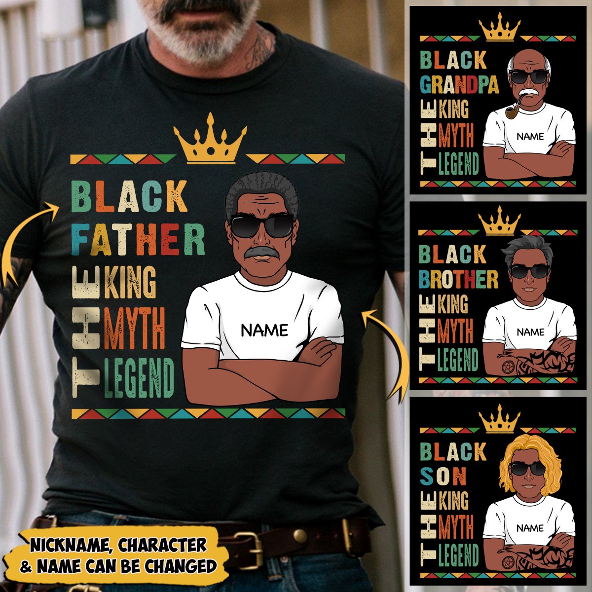Black Father/ Black Grandpa/ Black Uncle/ Black Brother/ Black Son The King The Myth The Legend shirts for Black Man, Nickname, Name & Character can be changed, HG98, HUTS