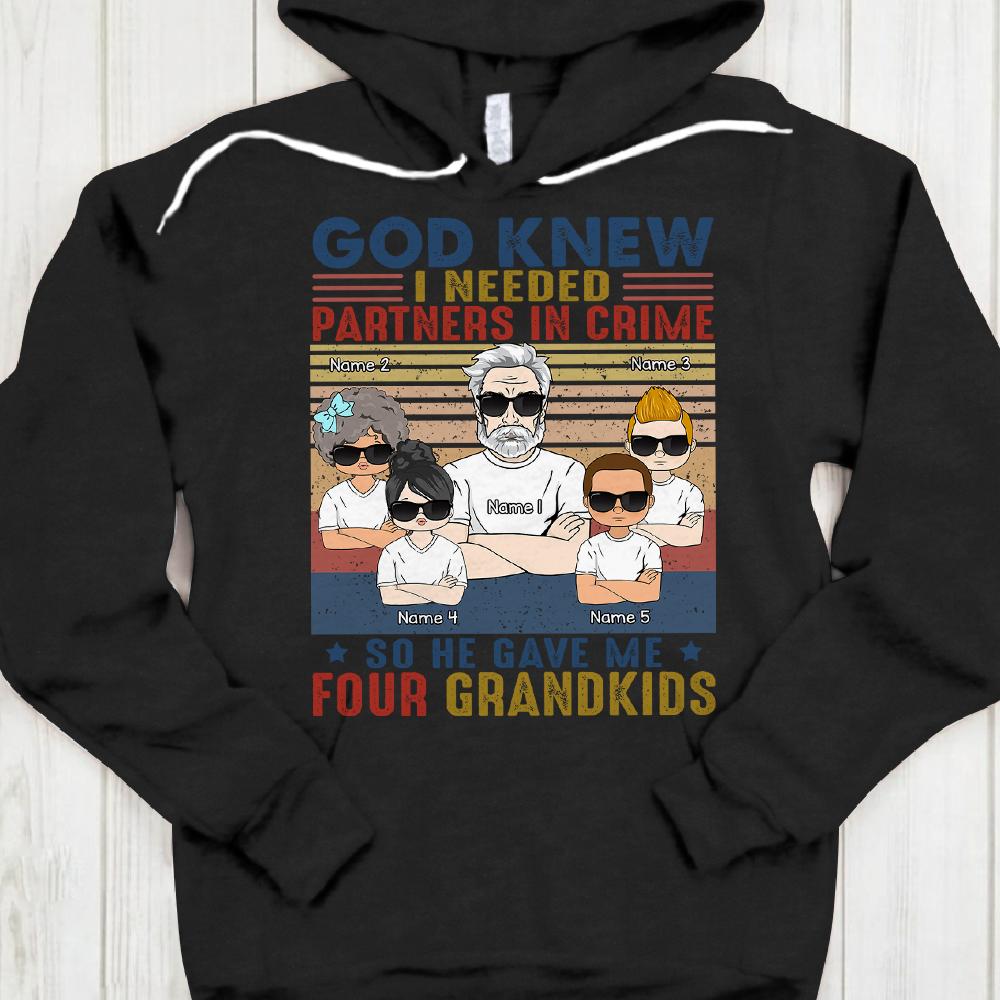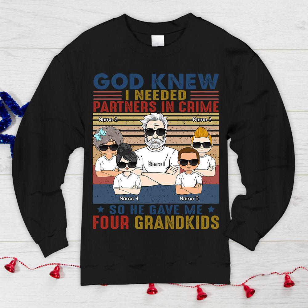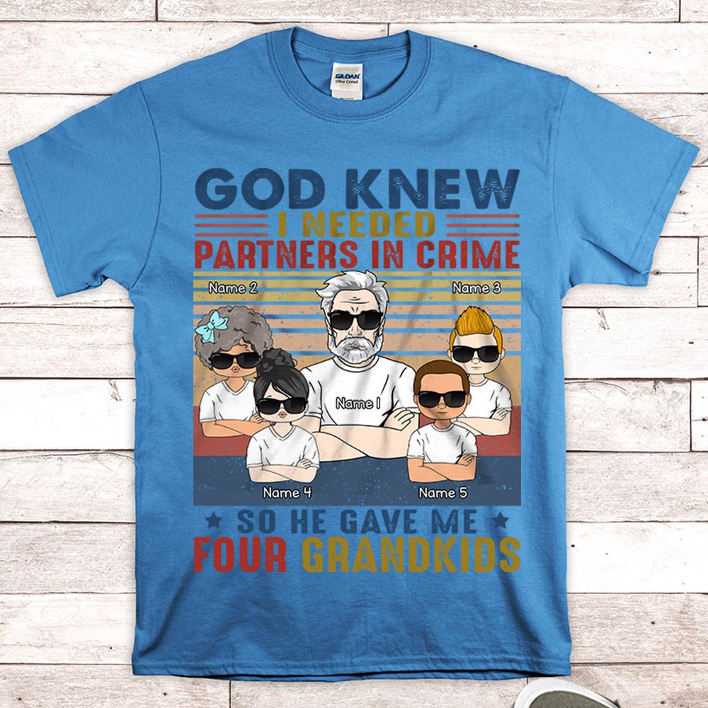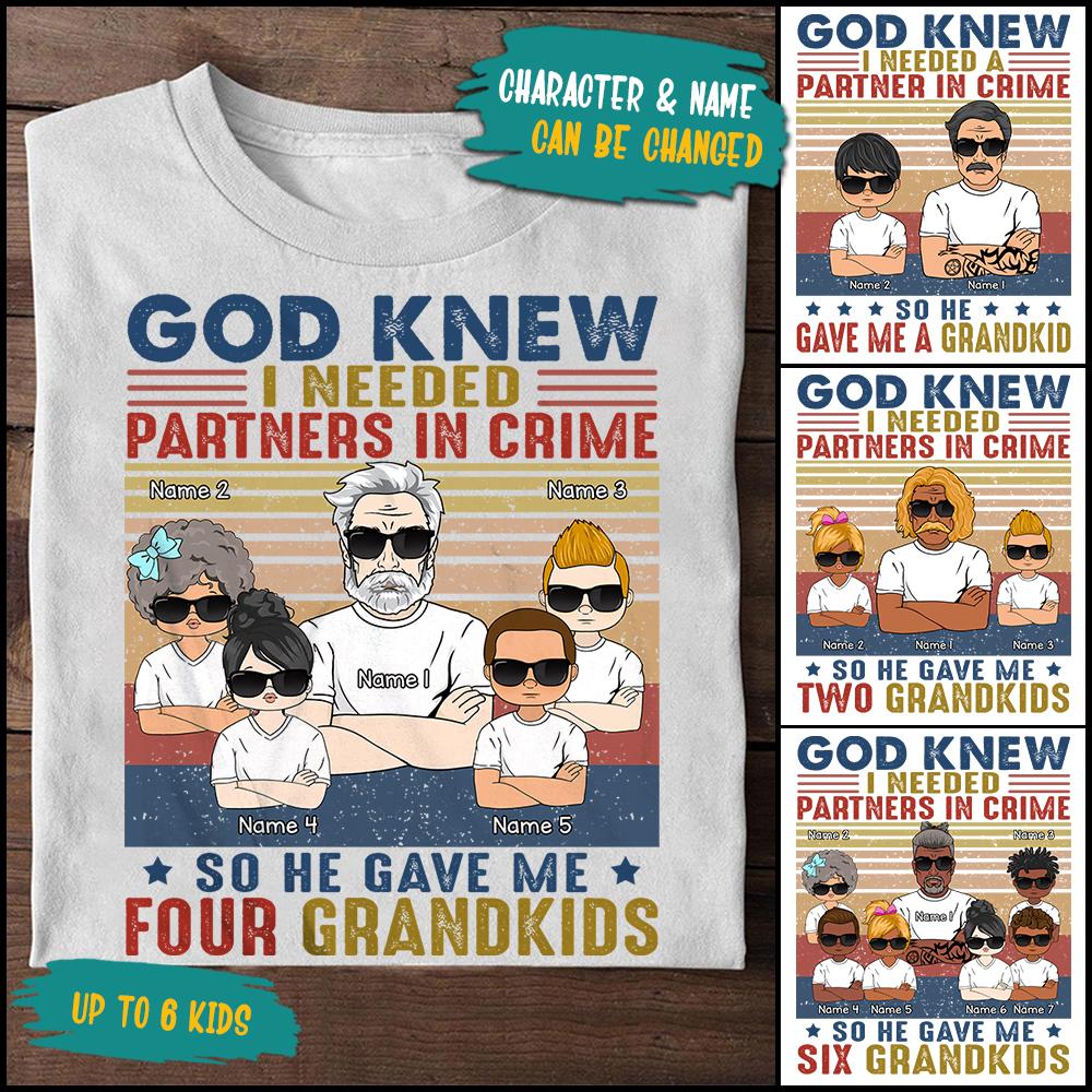 Custom God Knew I Needed Partners In Crime So He Gave Me Grandkids Shirts For Dad Or Grandpa, Number Of Kids, Name & Character Can Be Changed, HG98, PHTS