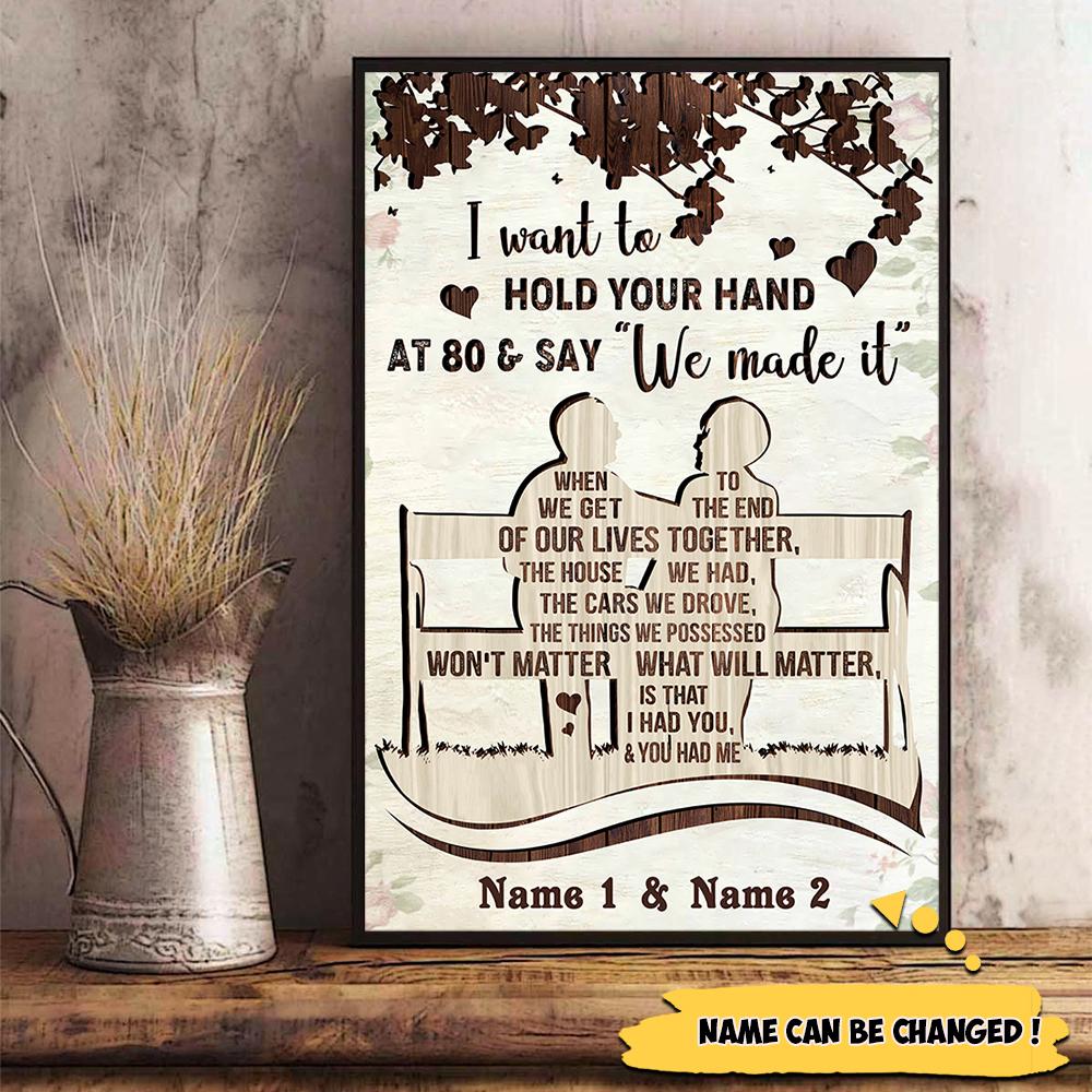 Custom I Want To Hold Your Hand At 80 & say “We made it" Poster & Canvas, Couple Sitting On Bench, Perfect Gift for Couples, Name can be changed, HN98, UOND