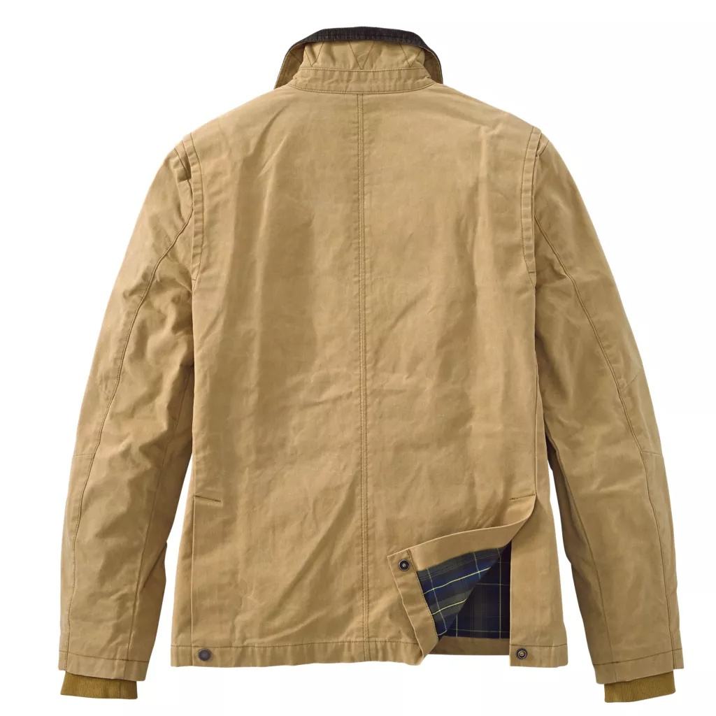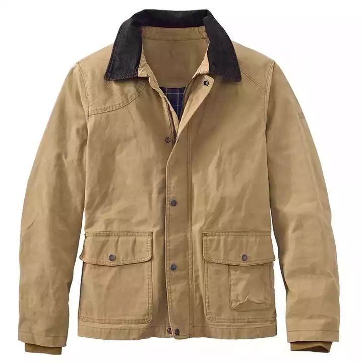jacket in khaki with a mature-looking cut-out collar. To prevent drafts, sleeves are made with inside elastic cuffs. The outside sleeve needs to appear tidy. This shirt opens and closes with a zip on the inside and a button-up on the outside. Two more pockets for personal goods are located on the front of the shirt. Shoulders are widened to give the wearer a sense of vitality. When the collar is broken, the shirt is highlighted since the collar is stitched with a different color inside. The shirt is khaki in color and is appropriate for motorcycle riders in the fall.